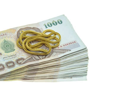 Close up Thai money in one thousand type banknotes with gold necklace isolated on white background