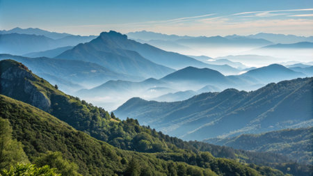 Blue toned mountain range with fog and mist covering the valleys below. Soft light and cold feeling. Italian Alps in autumn.