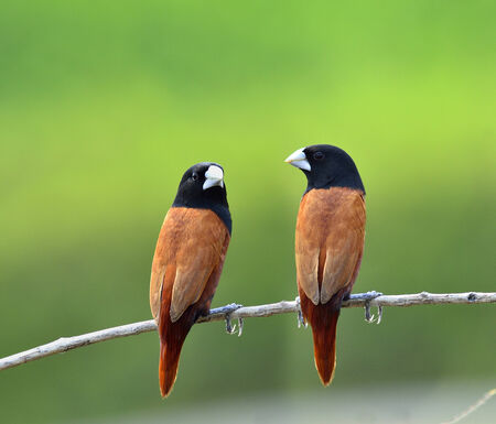 Pair of Black-headed Munia bird perching together on the branch with clear green background