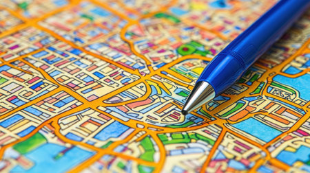 A close-up depiction of a vibrant city map featuring streets, parks, and notable landmarks, with a blue pen poised for navigation and detailed planning purposes.