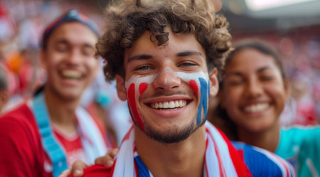 A young Austrian fan at a football match in a full stadium. Close-up of the face of a happy man with the Austrian flag painted on his cheek. A representation of the excitement and enthusiasm for the event