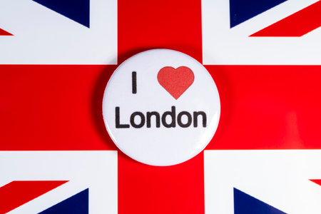 LONDON, UK - APRIL 27TH 2018: An I Love London badge pictured over the UK flag, on 27th April 2018.