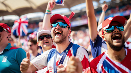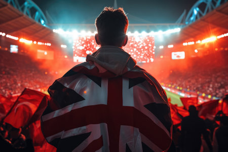 A British fan stands with a Union Jack flag draped over their shoulders, surrounded by a softly blurred crowd, capturing a moment of quiet determination and national pride.