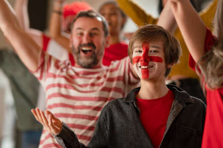 Football fan with England flag on the face at the stadium. Concept of 2024 UEFA European Football Championship