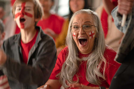 Excited senior woman football fan supproting English national team in live soccer match at stadium.