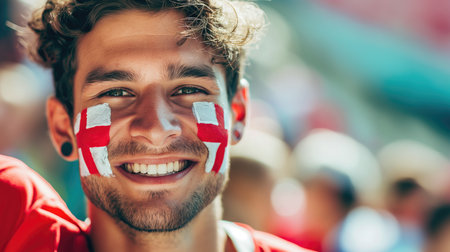 Energetic england fan with face paint cheering at stadium, football event atmosphere, copy space