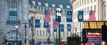 View of Regent Street, London at dusk. The street is decorated with NFL flags to celebrate the event and four NFL games played in capital in 2017.