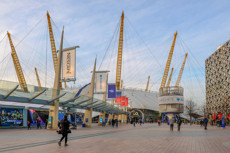 Greenwich, London, UK - February 14, 2018: The O2 dome with its surrounding shops and restaurants. People strolling along the walkway.