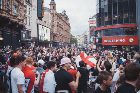London | UK - 2021.07.12: English fans waving flags at Leicester Square before the final Euro 2020 Football game