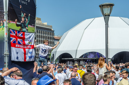 MADRID, SPAIN - JUNE 1, 2019: Tottenham Hotspur fans prior to the match between their team and Liverpool FC in the UEFA Champions League final, held in Madrid