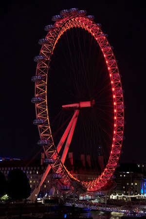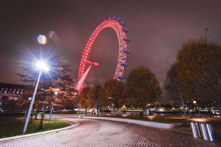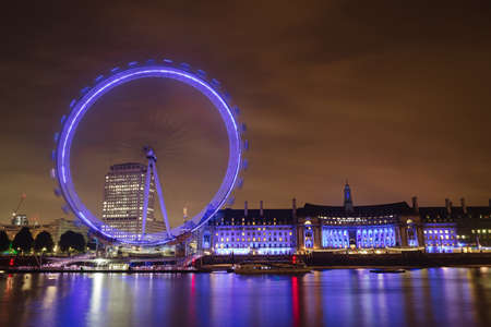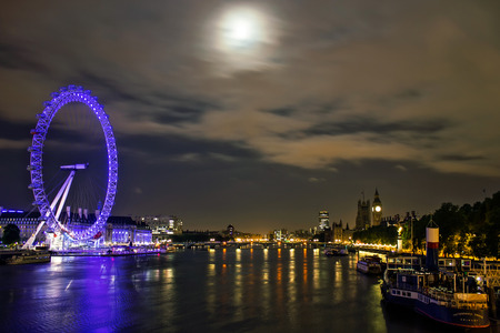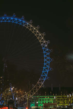 View of the London Eye at night - a famous tourist attraction over river Thames in the capital city London