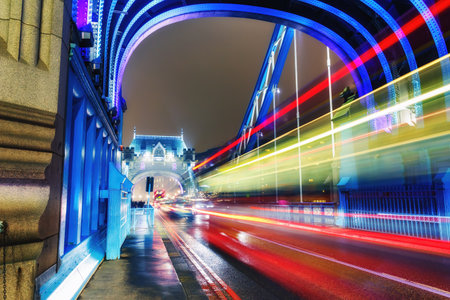 Tower Bridge in London, UK at night with moving red double-decker bus leaving light traces