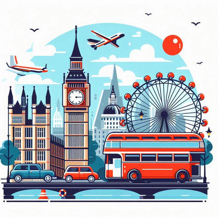 London skyline with famous buildings and ferris wheel. Vector illustration.