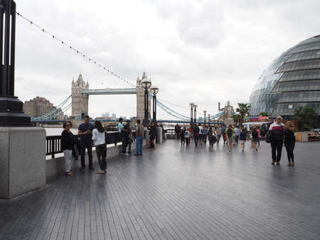 tower bridge and many tourist walking along the queen walk in london at evening, cloudy daytime, uk