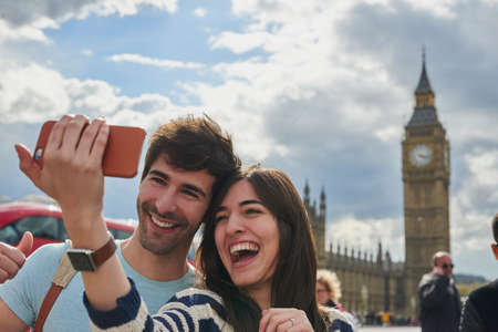 From London, with love. a young couple taking selfies in front of Big Ben while exploring the city of London.