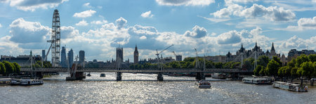 Aerial panorama view on London. View towards Houses of Parliament, London Eye and Westminster Bridge on Thames River.