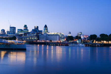 Beautiful view of London city landscape from Thames waterfront at night, handheld shot. Rapid growth and urban development concept.