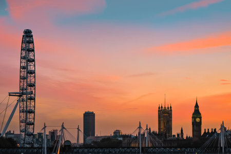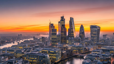 United Kingdom, London: Aerial view of Londons financial district at sunset, featuring modern skyscrapers and iconic landmarks against a vibrant sky. Drone flight
