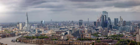 Elevated panorama of the London skyline from London Bridge to the City during a moody day with gray clouds, England