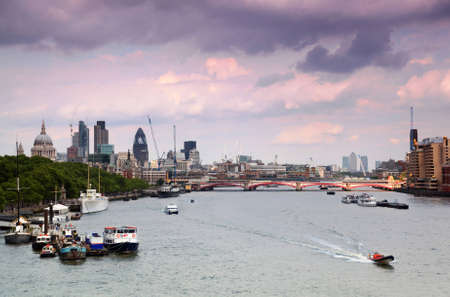 Beautiful panoramic summer scene,with St.Paul's Cathedral and Blackfriars Bridge ahead, depicting daily life on the iconic River Thames,at full tide,with blue skies and clouds drifting overhead.