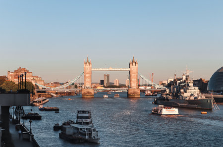 London, United Kingdom - August 10, 2022: Tower Bridge and Thames River at golden hour sunset
