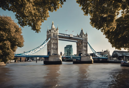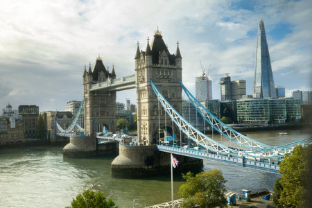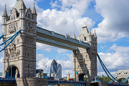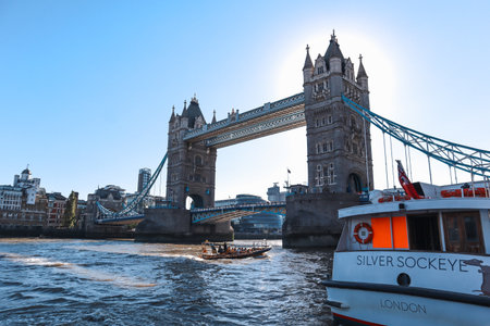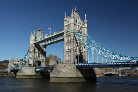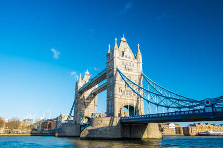 Tower Bridge in London, the UK. Bright day over London. Drawbridge opening.
