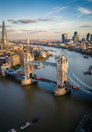 UK, London cityscape at sunset, iconic Tower Bridge spanning the River Thames, modern skyscrapers reflecting golden light against the twilight sky. Travel destination. Aerial drone flight panorama