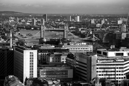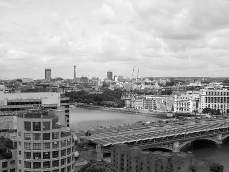 Aerial view of River Thames in London, UK in black and white