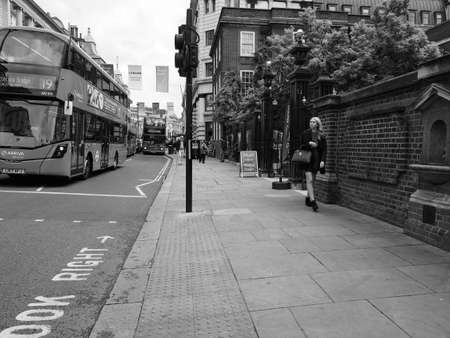 LONDON, UK - CIRCA SEPTEMBER 2019: Regent Street view with double decker bus in black and white