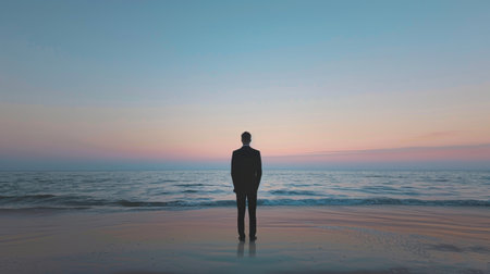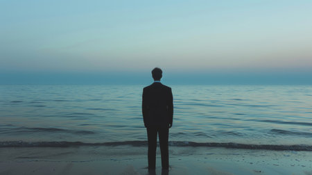 Desolate individual gazing out to sea isolated on a blue gradient background