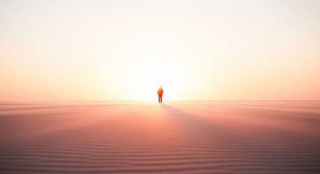 A person stands facing a soft glowing horizon during sunset, observing the colors of the sky and lost in thought.