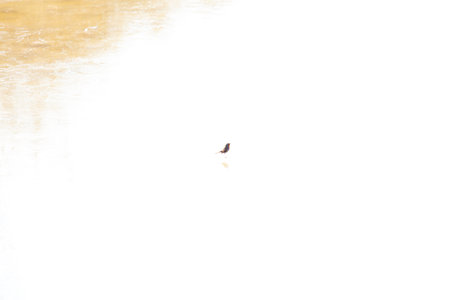 A solitary bird reflected in calm water. Peaceful, minimalist scene.