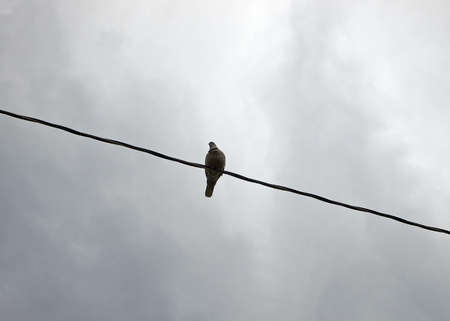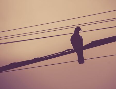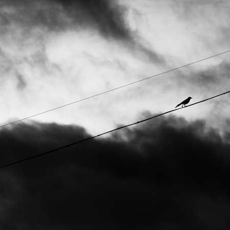 Alone bird on a wire or electric line on the stormy sunset sky background. Loneliness concept