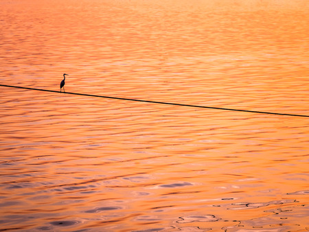 Little Chinese egret bird perched on a rope over the sea, in sunset light