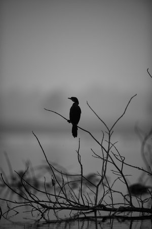 cormorant silhouette on the lake, black and white photo