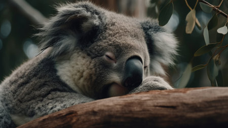 This captivating image features a koala peacefully sleeping in a tree, showcasing its soft fur and serene environment. A true representation of wildlife tranquility.