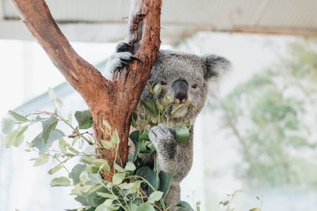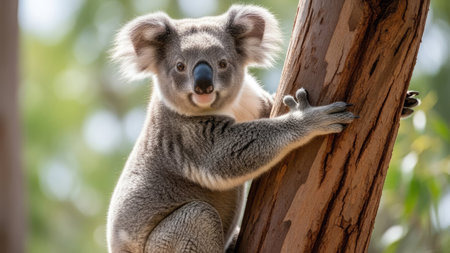 A koala bear is seen clinging to a tree trunk, showcasing its natural habitat. The image displays the animal with gray fur, a fluffy appearance, and visible claws. The composition utilizes natural lighting, highlighting the textures of the tree bark and the surrounding greenery. It could be used in various commercial projects.