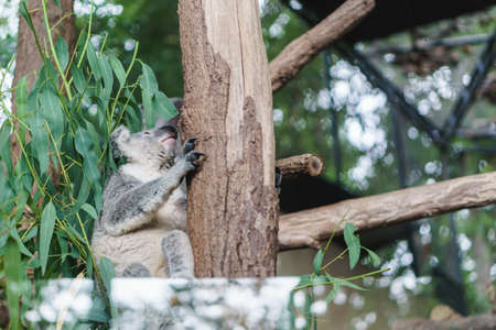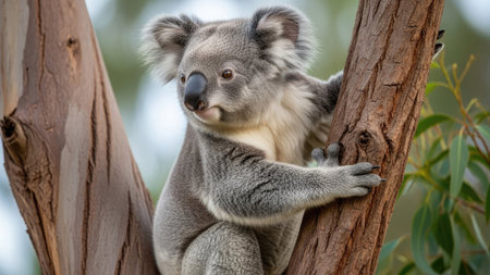 Koala bear climbing a tree in the Australian eucalyptus forest