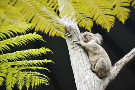 Koala on the smooth bark of a big branch under the leaves of a eucalyptus tree in Magnetic Island, Townsville, Queensland, Australia