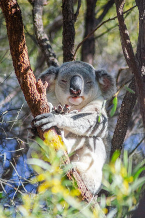 Cute koala bear resting on eucalyptus tree in its natural habitat on Magnetic Island, Queensland, Australia.