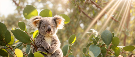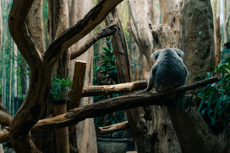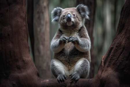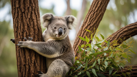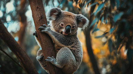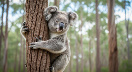 Koala bear clinging to a eucalyptus tree trunk, nestled in its natural habitat within an Australian forest teeming with wildlife