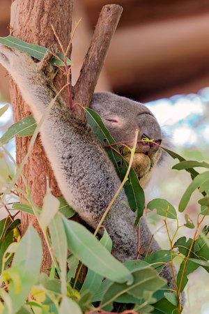 sleepy koala cuddled up on eucalyptus gum tree branch surrounded by green leaves, shot at shallow depth of field