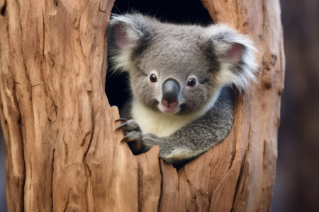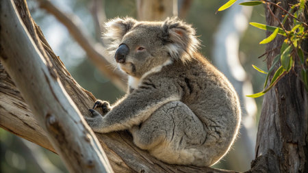 A koala bear sits embraced within the trunk and branches of a tree. The image displays a close-up with soft focus bokeh in the background. The scene is bathed in natural daylight showcasing shades of brown, green and gray. Suitable for conservation projects or editorial publications.