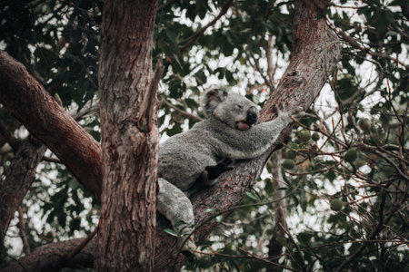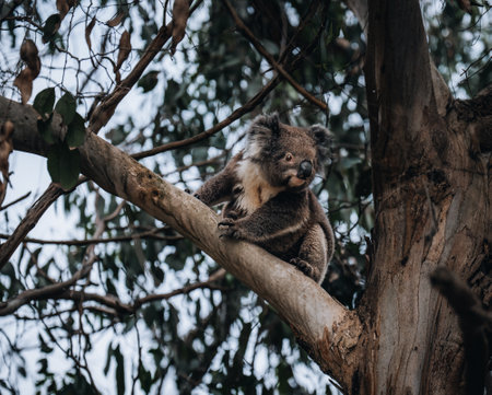 A charming koala rests comfortably on a tree branch, showcasing its fluffy fur and captivating eyes. This peaceful image captures the essence of wildlife conservation in Australia.