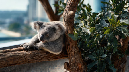 A charming and serene scene of a koala peacefully napping on a tree branch, surrounded by lush green leaves in an urban setting, highlighting wildlife.