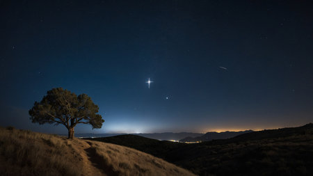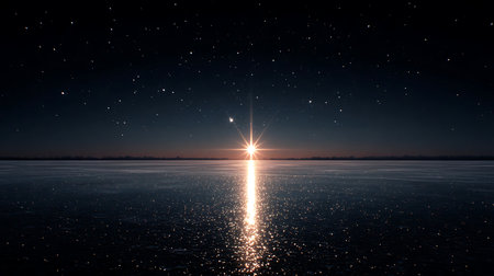 Bright star glimmers in the night sky as a shooting star streaks by, casting a magical glow at sunset.