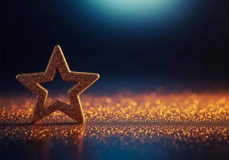 A golden star shape glimmers on a shiny surface, surrounded by soft, colorful bokeh lights at night.