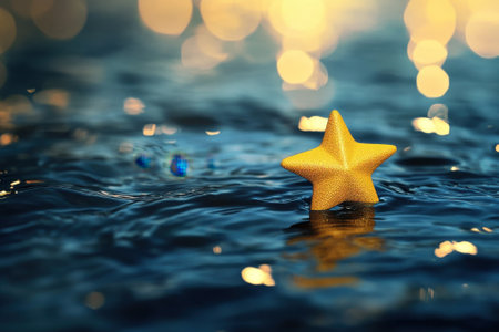 A golden star drifts gently on water under a soft glow of lights, creating a tranquil nighttime ambiance.