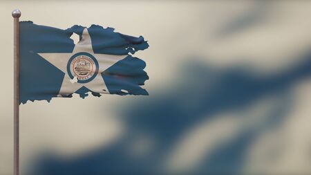 Houston Texas 3D tattered waving flag illustration on flagpole. Isolated on blurred sky background with space on the right side. Depth of Field effect.