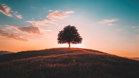 Solitary tree stands majestically on golden hill, surrounded by vast, open landscape. warm hues of grass create serene and tranquil atmosphere, evoking sense of peace and solitude